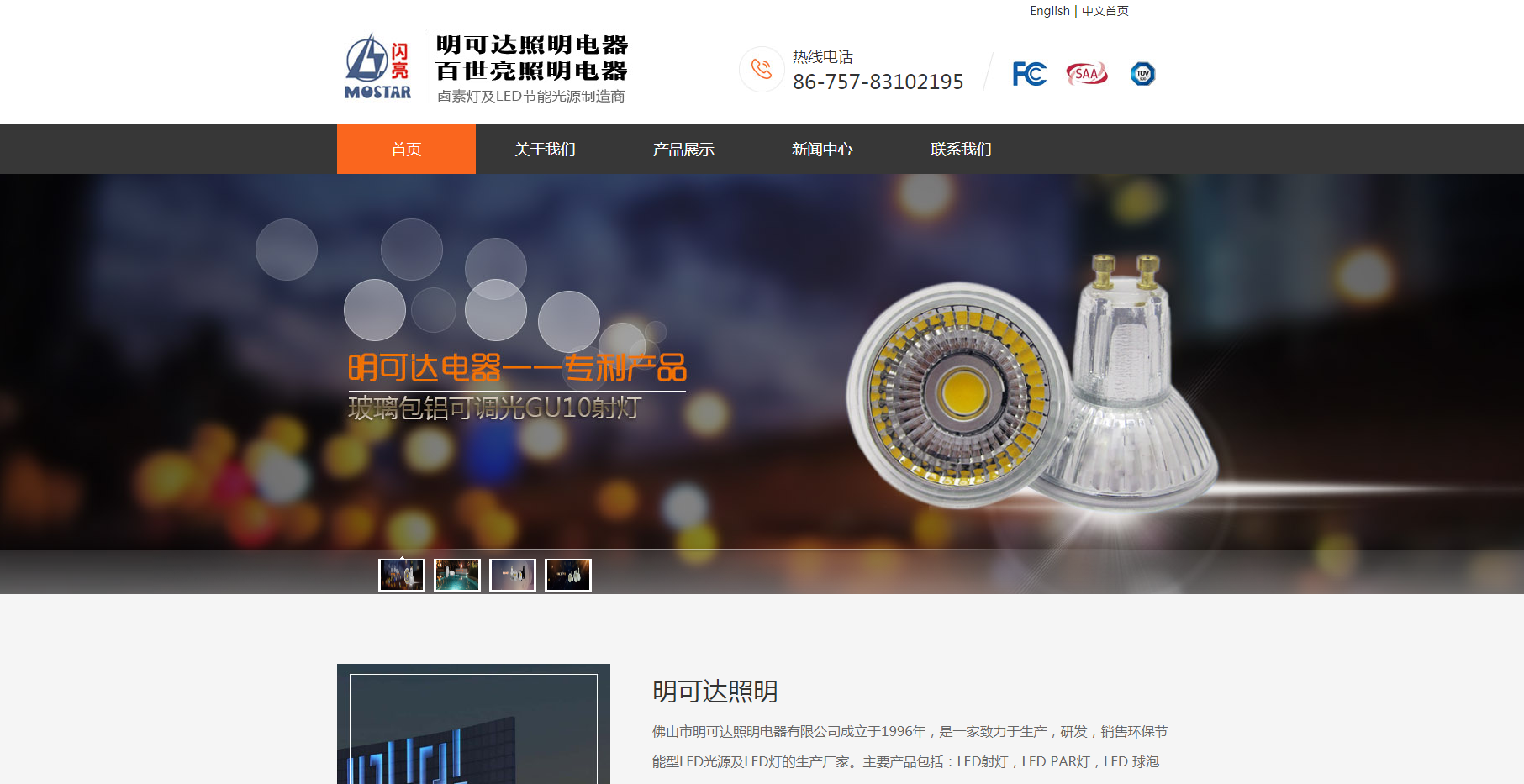 佛山市明可達照明電器有限公司成立于1996年,是一家致力于生產(chǎn),研發(fā),銷售環(huán)保節(jié)能型LED光源及LED燈的生產(chǎn)廠家。主要產(chǎn)品包括:LED射燈,LED PAR燈,LED 球泡燈、影棚造型燈等,通過了CE, ROHS, TUV, SAA, FCC認(rèn)證,并擁有數(shù)項產(chǎn)品專利。