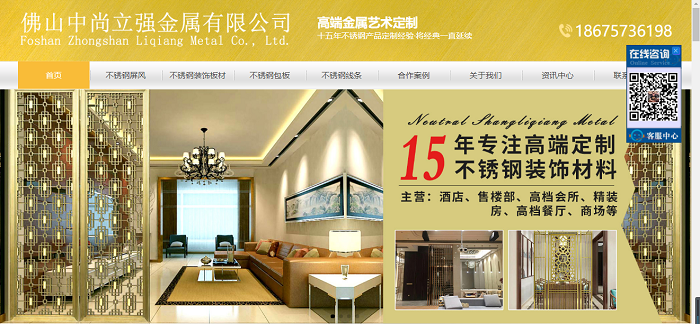 佛山中尚立強金屬有限公司位于佛山不銹鋼產(chǎn)業(yè)基地,及不銹鋼產(chǎn)品生產(chǎn)加工,研發(fā)銷售于一體。主要生產(chǎn)和銷售各種材質(zhì)的不銹鋼裝飾板材,承接各種不銹鋼裝飾工程提供各種安裝解決方案,定制不銹鋼制品、屏風、酒柜,公司配套有精密剪壓刨設備、平板激光機、激光切管機、焊接打磨制品部、真空電鍍設備。