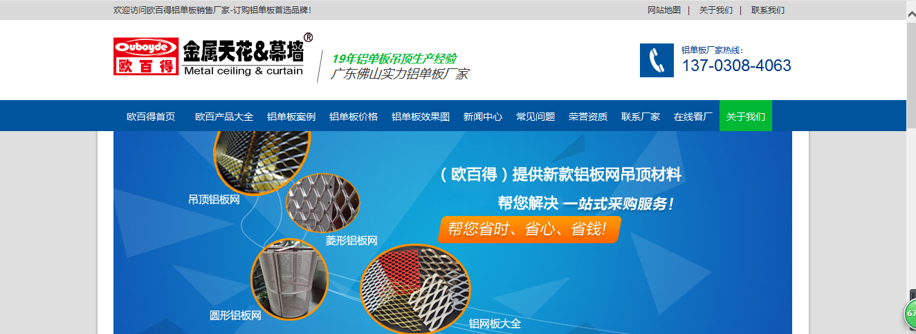 佛山市歐百建材科技有限公司始建于21世紀,位于佛山市南海區(qū)里水鎮(zhèn),(www.lvwangban.cn)。歐百得是集生產、銷售于一體的建材公司,其主要產品有鋁天花和鋁幕墻2大系列,系列包含:鋁板網,鋁網板,吊頂鋁網板,吊頂鋁板網,沖孔鋁板網,圓孔鋁板網,金屬網板材料,使歐百建材產品深受全國消費者的信賴,產品暢銷國內23個省及市。