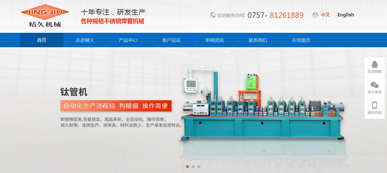 2000年開始研發(fā)生產(chǎn)不銹鋼制管機(jī),憑著對國內(nèi)外領(lǐng)先焊管設(shè)備經(jīng)驗的積累和專業(yè)創(chuàng)新的精神,使“精久”牌不銹鋼制管機(jī)一直是不銹鋼行業(yè)內(nèi)的龍頭產(chǎn)品,其“高精度、速度高、穩(wěn)定性、耐用、低成本”等出眾的品質(zhì)與優(yōu)越的機(jī)械性能,得到了業(yè)界的廣泛認(rèn)可,是國內(nèi)大型不銹鋼焊管生產(chǎn)企業(yè)首選的設(shè)備配套合作商,合作伙伴包括錦嘉鈦業(yè)、臺灣協(xié)峰、海利、美的、萬佳泓、等眾多大型企業(yè)。品質(zhì)一馬當(dāng)先,造就了“精久”牌不銹鋼制管機(jī)遙遙領(lǐng)先的業(yè)績,產(chǎn)品遠(yuǎn)銷越南、印度、印尼、孟加拉、俄羅斯等多個國家。
