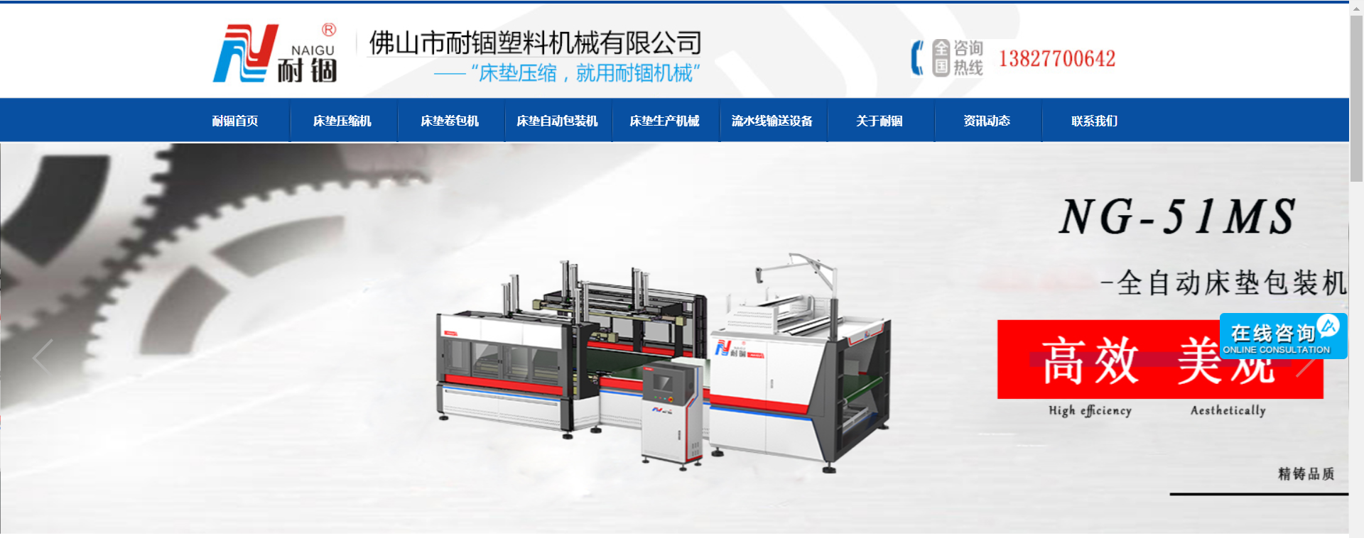 今天讓我們一起來分享一下床墊卷包機(jī)械網(wǎng)站設(shè)計(jì)作品: 佛山市耐錮塑料機(jī)械有限公司成立于2004年,經(jīng)過多年改革升級(jí),前身名為佛山市耐錮塑料包裝材料廠2016年更名為佛山市耐錮塑料機(jī)械有限公司,現(xiàn)占地面積20000多平米,擁有10余人的研發(fā)團(tuán)隊(duì),專業(yè)研發(fā)與生產(chǎn)全自動(dòng)床墊壓縮包裝設(shè)備、床墊卷包機(jī)械、床墊印刷包裝膜、床墊壓縮包裝袋,PVC/PE薄膜等多種產(chǎn)品,為床墊企業(yè)打造高競爭力的包裝而努力創(chuàng)新。
