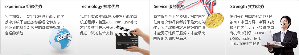 - 技術(shù)優(yōu)勢:我們擁有多年WEB技術(shù)開發(fā)經(jīng)驗(yàn)的系統(tǒng)工程師,精通ASP、PHP、JSP等動態(tài)網(wǎng)頁交互技術(shù)開發(fā),保證一流的技術(shù)支持。