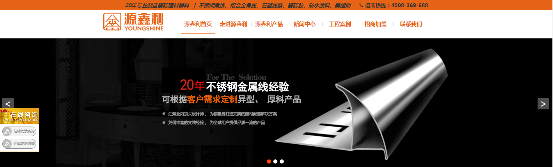 今日分享不銹鋼修邊線:佛山市國(guó)鋁五金制品有限公司創(chuàng)始于2000年,位于全國(guó)知名陶瓷之鄉(xiāng)佛山三水,是國(guó)內(nèi)規(guī)模較大的建材裝飾輔料的制造商與銷(xiāo)售商,一直致力于不繡鋼線條、鋁合金線條、石塑線條、防水涂料、美縫劑和瓷磚膠等產(chǎn)品的設(shè)計(jì)、制造、銷(xiāo)售及系統(tǒng)服務(wù)為一體的國(guó)內(nèi)知名建材企業(yè)。公司產(chǎn)品獲得國(guó)家發(fā)明專(zhuān)利及實(shí)用新型專(zhuān)利等一百多項(xiàng),擁有源鑫利、富麗家、好望閣等知名商標(biāo),并評(píng)為國(guó)家高新技術(shù)企業(yè),2010年開(kāi)始陸續(xù)成立鋼帶事業(yè)部、瓷磚裝飾線條事業(yè)部、防水材料事業(yè)部、不銹鋼天花吊頂及竹木纖維墻板事業(yè)部等5個(gè)事業(yè)部。