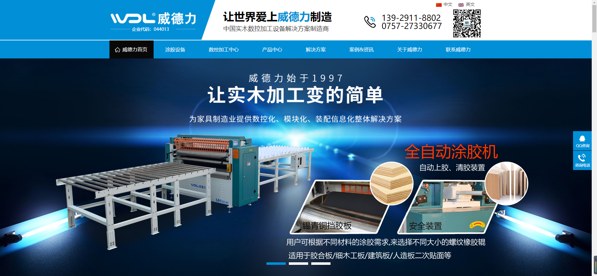 今天讓我們一起來分享一下木工壓機(jī)網(wǎng)站建設(shè)作品:廣東威德力機(jī)械實(shí)業(yè)股份有限公司位于中國(guó)木工機(jī)械重鎮(zhèn)——佛山市順德區(qū)倫教鎮(zhèn).我司經(jīng)過近 20 年的努力,目前已擁有十萬多平方米的現(xiàn)代化生產(chǎn)廠房,投入成熟的數(shù)控自動(dòng)化加工設(shè)備和檢測(cè)設(shè)施,建立了一支數(shù)控系統(tǒng)應(yīng)用與機(jī)電一體化設(shè)計(jì)軟硬件開發(fā)相結(jié)合的高素質(zhì)團(tuán)隊(duì),公司自主創(chuàng)新開發(fā)各類木材加工工藝的設(shè)備,包括:木工壓機(jī)(且我司是中國(guó) 3000 噸木工壓機(jī)較早與產(chǎn)銷規(guī)模較大的企業(yè))、數(shù)控鋸、數(shù)控銑機(jī)、數(shù)控榫槽機(jī)、數(shù)控加工中心、數(shù)控打角鉆孔攻牙機(jī)、木工銑床、木工鋸床、集成材加工設(shè)備、木工機(jī)械輔助設(shè)備、環(huán)保設(shè)備的除塵設(shè)備和噴漆保護(hù)設(shè)備,涵蓋了木材加工業(yè)鋸切、刨切、集成材銑削、拼接、拼板、砂光及家具制造業(yè)中銑、鋸、鉆加工,成型、貼面、砂光、裝配、噴漆等工序所需的機(jī)械裝備。威德力全國(guó)200多家銷售服務(wù)中心覆蓋了各省份的一、二級(jí)城市,輻射華北、華中、華南、西南等區(qū)域;在海外市場(chǎng)的銷售與推廣上,公司產(chǎn)品已遠(yuǎn)銷至國(guó)外 80 多個(gè)國(guó)家。近20年來兢兢業(yè)業(yè)地發(fā)展。2013年被廣東省認(rèn)定為廣東省制造企業(yè) 500 強(qiáng)。