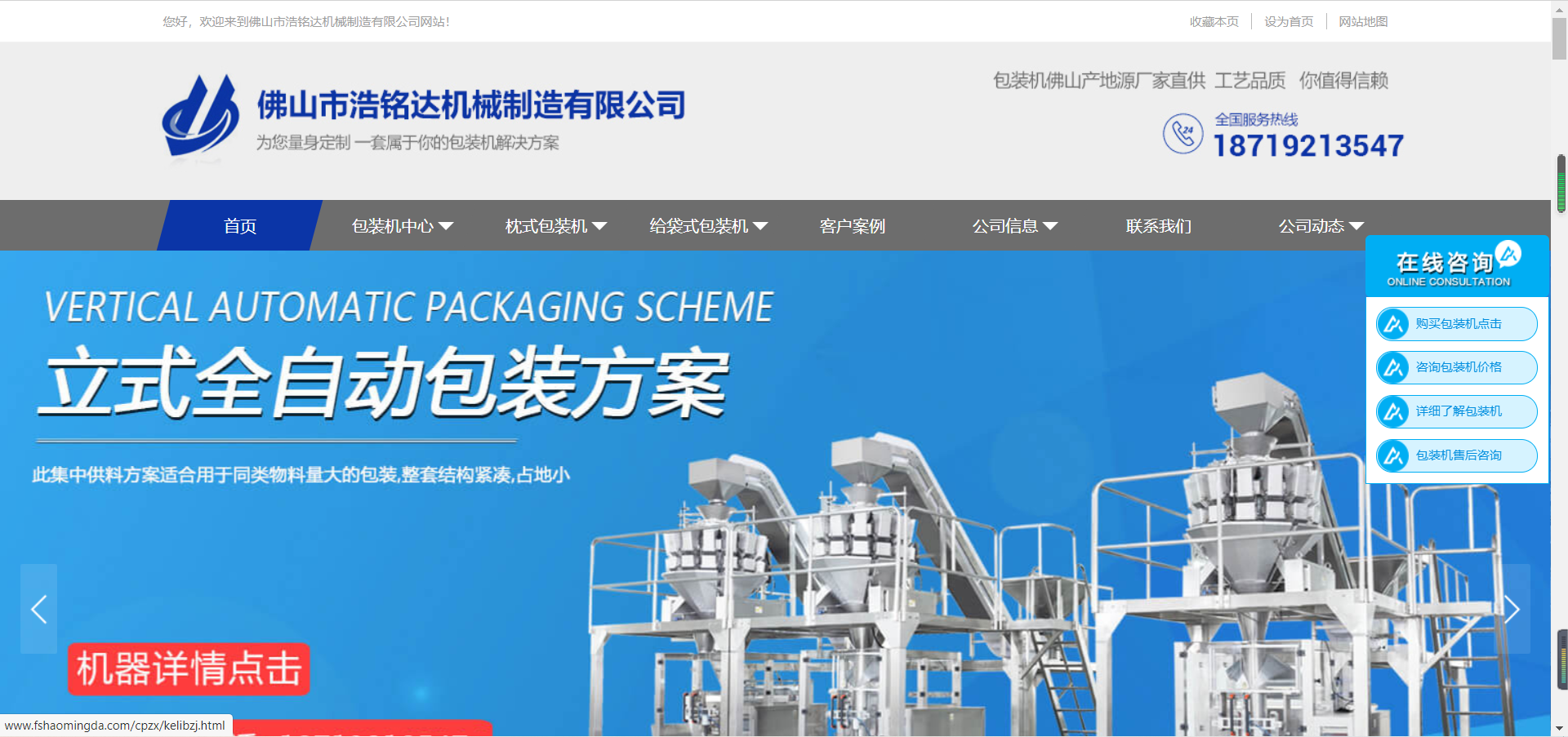 今天讓我們一起來分析一下包裝機(jī)械網(wǎng)站推廣案例:佛山市浩銘達(dá)機(jī)械制造有限公司是一家專業(yè)生產(chǎn)、制造、銷售和售后服務(wù)為一體化的包裝機(jī)械公司。公司堅持“以質(zhì)量求生存,以信譽求發(fā)展”的經(jīng)營理念。生產(chǎn)的自動包裝機(jī)具有設(shè)計合理,操作簡便等特點。產(chǎn)品廣泛應(yīng)用于食品、化工、日用品,五金零件等的包裝行業(yè)。本公司憑著“誠信為本”的精神。開拓創(chuàng)新,致力于提供優(yōu)良的包裝機(jī)械設(shè)備,為客戶創(chuàng)造價值,與您一起成長。