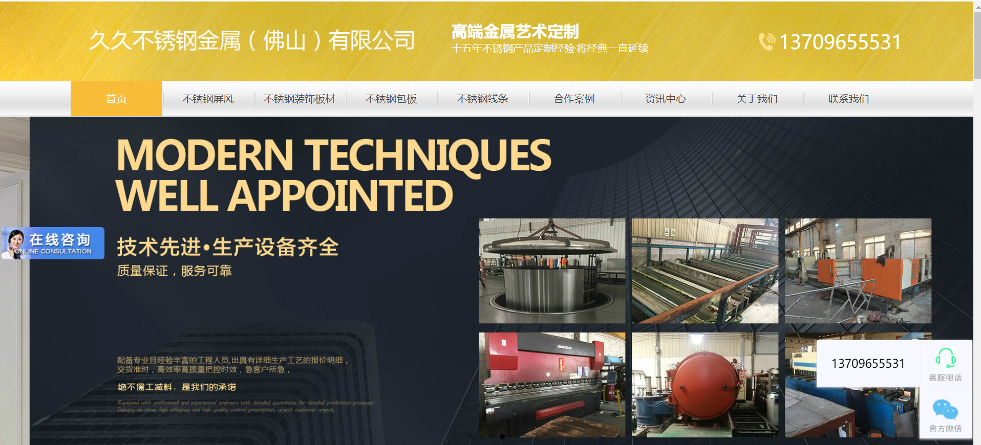 久久不銹鋼(佛山)有限公司位于佛山不銹鋼產(chǎn)業(yè)基地,及不銹鋼產(chǎn)品生產(chǎn)加工,研發(fā)銷售于一體。主要生產(chǎn)和銷售各種材質(zhì)的不銹鋼裝飾板材,承接各種不銹鋼裝飾工程提供各種安裝解決方案,定制不銹鋼制品、屏風、酒柜,公司配套有精密剪壓刨設備、平板激光機、激光切管機、焊接打磨制品部、真空電鍍設備。