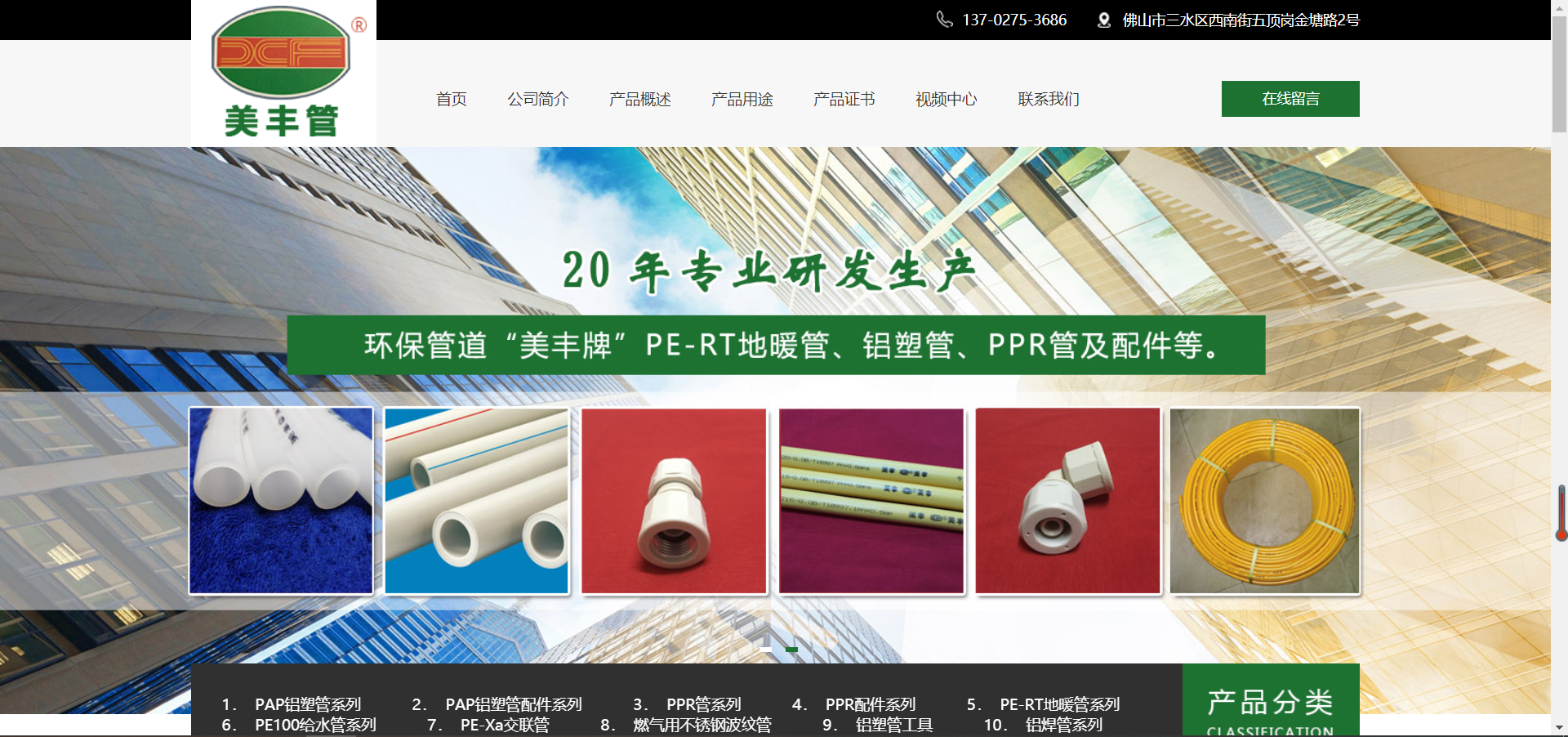 佛山市三水美豐鋁塑復(fù)合管有限公司創(chuàng)辦于1999年,工廠坐落于廣東佛山市三水區(qū)西南街五頂崗金塘路2號。用先進(jìn)的生產(chǎn)技術(shù)和設(shè)備,專業(yè)生產(chǎn)環(huán)保管道“美豐牌”鋁塑復(fù)合管(包括冷熱水用管、燃?xì)鈱S霉堋嚎s氣體輸送管)、專用地暖PE-RT管、工程用PP-R管、PE100燃?xì)庥霉芎徒o水管、特殊領(lǐng)域用鋁焊管及(鋁塑管、PERT管)專用塑料合金管件。生產(chǎn)過程嚴(yán)格執(zhí)行ISO9001質(zhì)量體系,確保產(chǎn)品達(dá)到國家檢測要求并符合歐美先進(jìn)國家同類產(chǎn)品質(zhì)量標(biāo)準(zhǔn)。