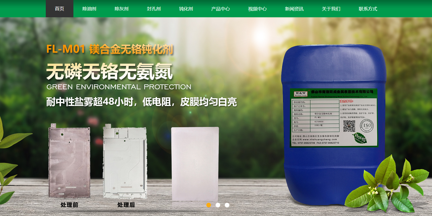 主營產(chǎn)品為:鋁,鎂合金,銅,不銹鋼等環(huán)保型金屬表面處理添加劑。如:除油除蠟除銹劑,無氨氮環(huán)保除灰劑,陽極染料,中高溫封孔劑,中高溫?zé)o鎳封孔劑,三價鉻鈍化劑,鎂合金除油,活化,表調(diào),鈍化劑等。