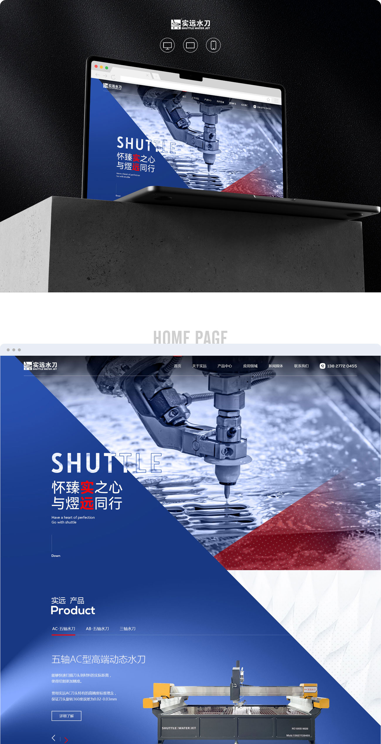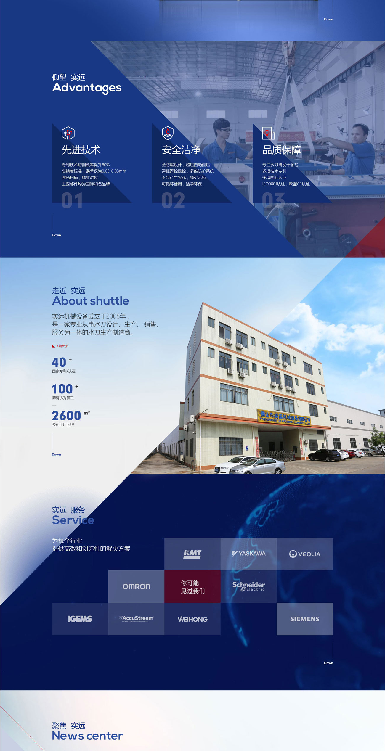 網(wǎng)站圍繞“切割”為主題,運用大塊斜切色塊,直面展現(xiàn)實遠水刀的威力。深藍色為主色調(diào),紅色為點綴顏色,讓整個畫面更加飽滿。
